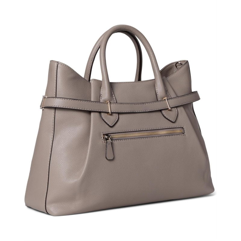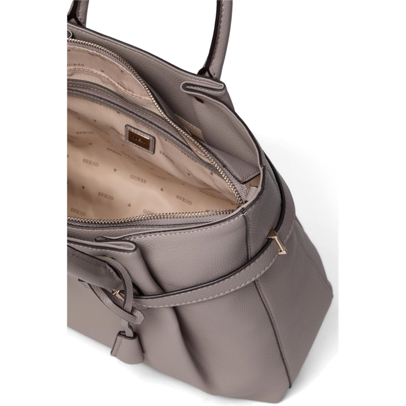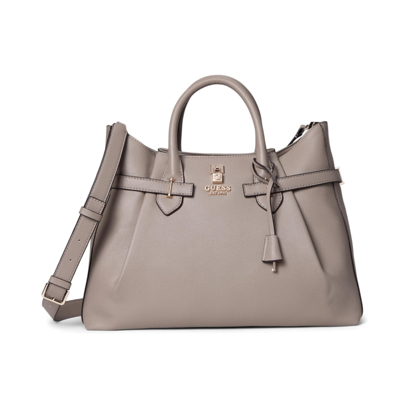 - The GUESS Yesba Girlfriend Satchel is crafted in eco pebble polyurethane for a luxe look. Designed with dual top handles and a detachable crossbody strap, it offers versatile carry options to suit your day. The structured silhouette features a zippered top closure and protective bottom feet, helping maintain its shape while keeping your belongings secure.