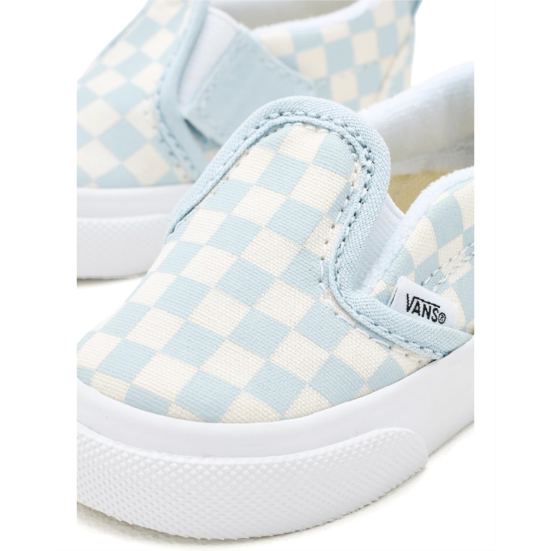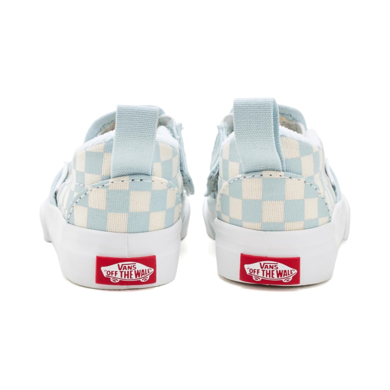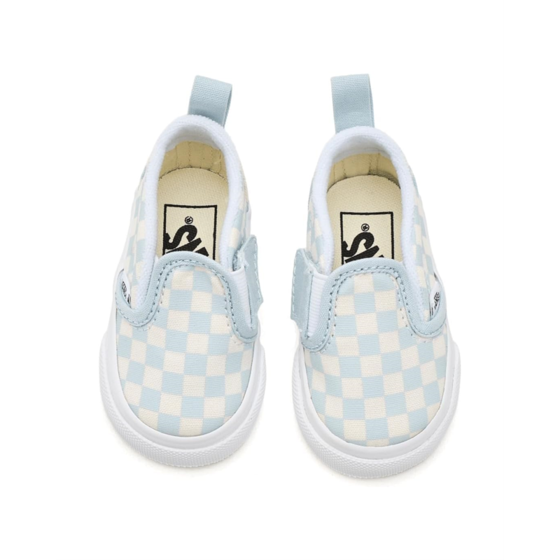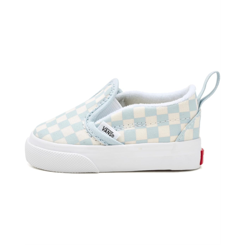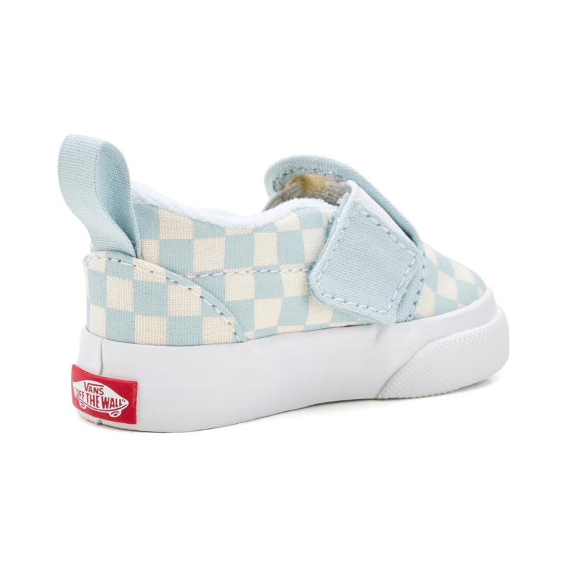 - The Vans Kids Slip-On V is designed for durability, comfort, and easy wear. Built with a canvas upper for a classic look and long-lasting strength, it also features a padded collar that enhances support and cushioning for little feet. The shoe is equipped with a side hook-and-loop strap closure, making it simple to put on and take off, while still ensuring a secure fit.